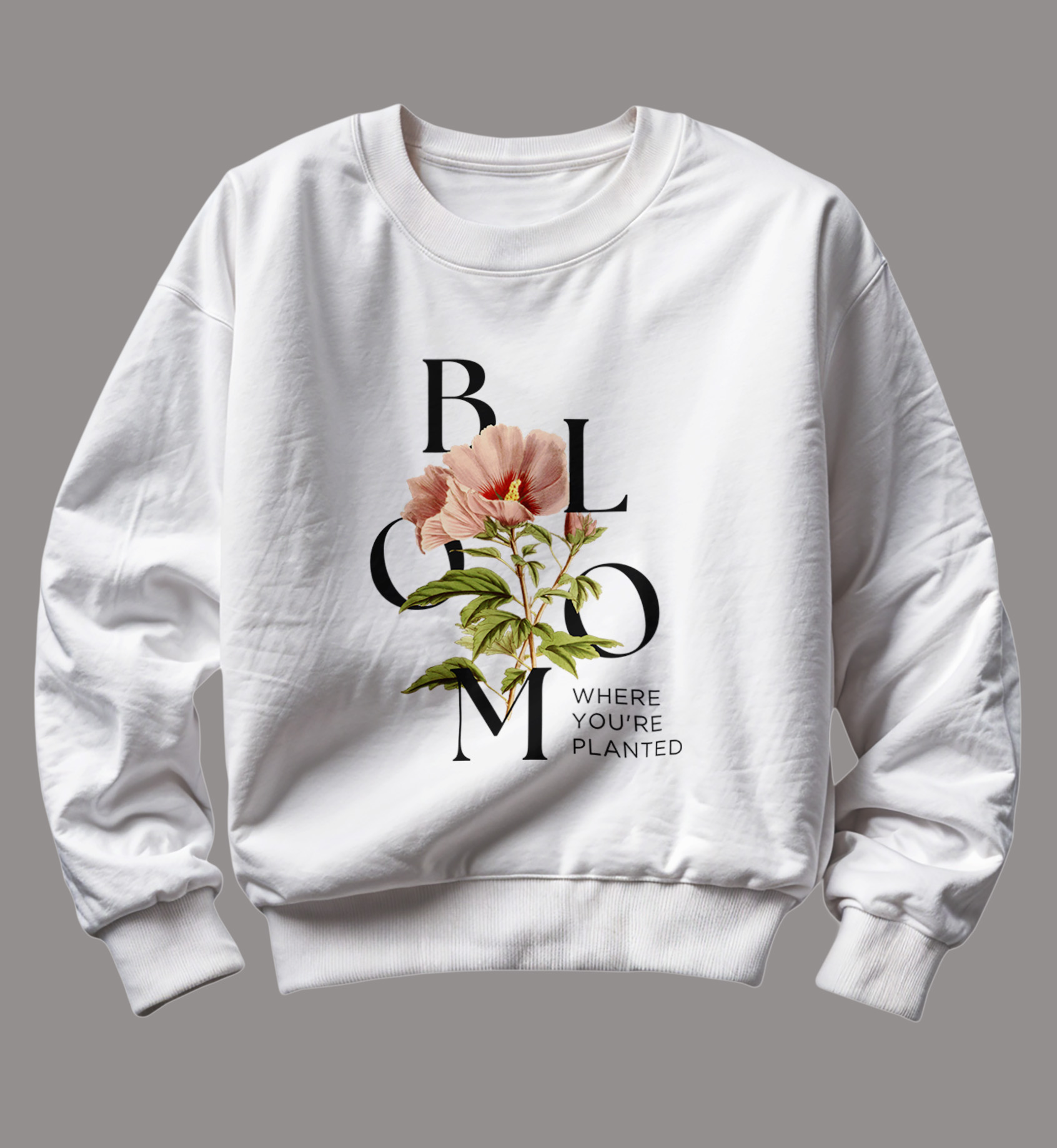 The centerpiece features a soft pink floral artwork surrounded by clean, modern lettering that spells BLOOM, paired with the inspiring message “Where You’re Planted.” This design encourages positivity and growth, making it more than just apparel — it’s a mood, a mindset, and a lifestyle.